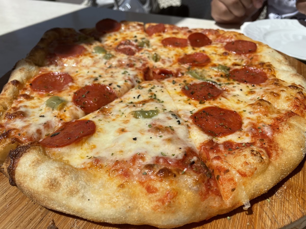 The Pizza is super delicious. The cheese was supery cheesy and it looked like straight out of a ad. It was super nice. They serve a glas with fruit slice and ice cubes if you get a drink. Thats a cool touch.